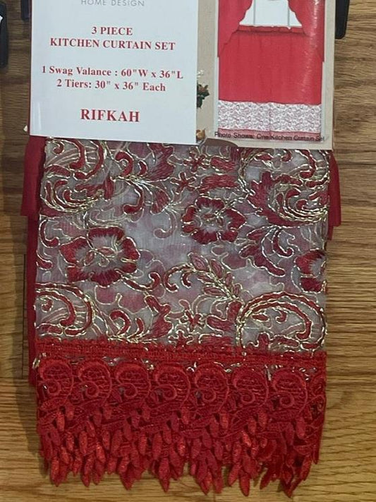 3 Piece embroidered Holiday Christmas kitchen curtain Red w gold