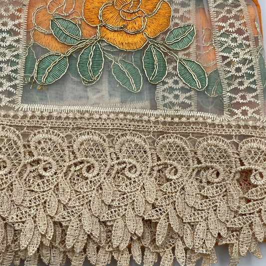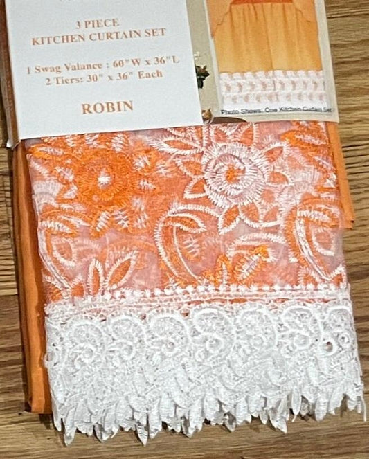 3 piece Kitchen curtain lace embroidered Stitch orange w white