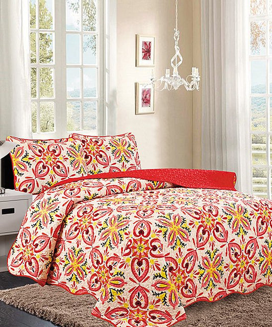 9 Piece Quilt w Sheet Set Medallion Reversible Pattern Print Red KING